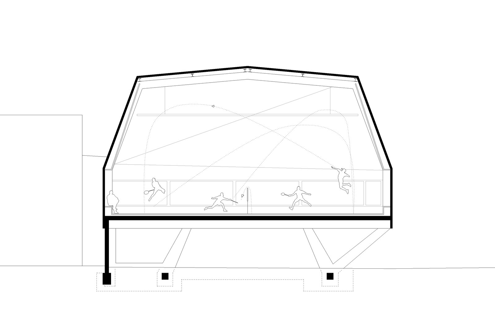 Die räumlichen Eigenschaften des Badmintonspiels werden so im Rhythmus der Tragstruktur sowie der polygonalen Geometrie des Hallenvolumens innen wie aussen erlebbar.