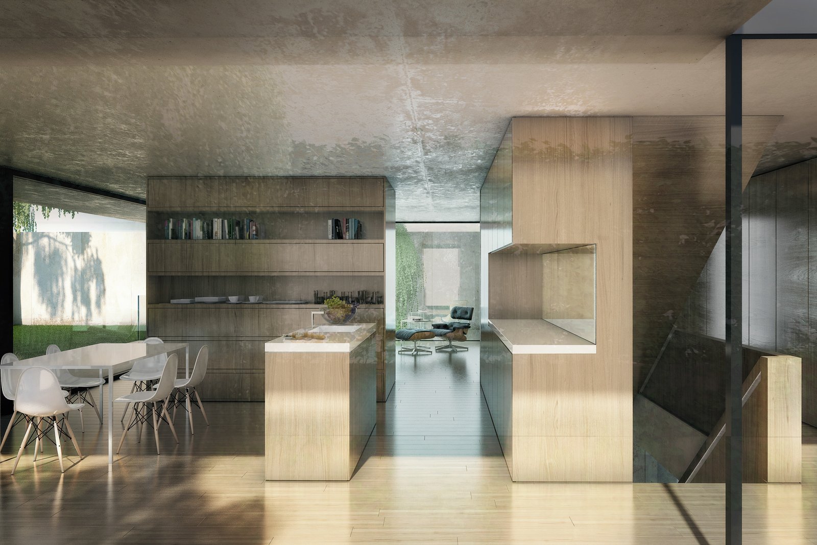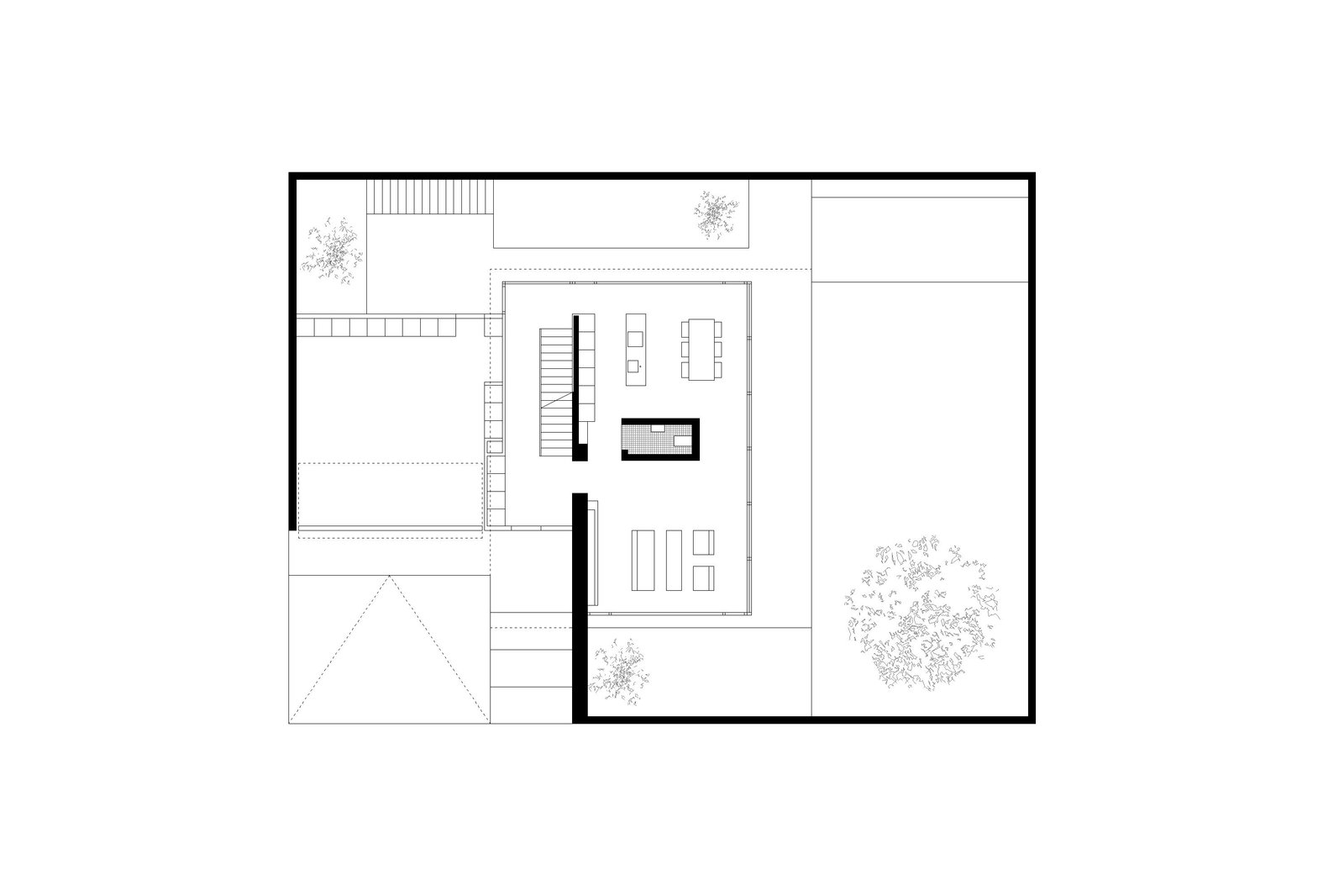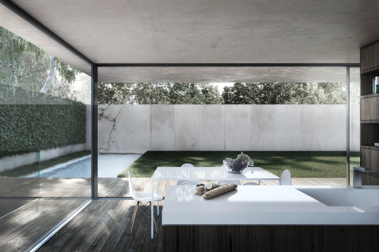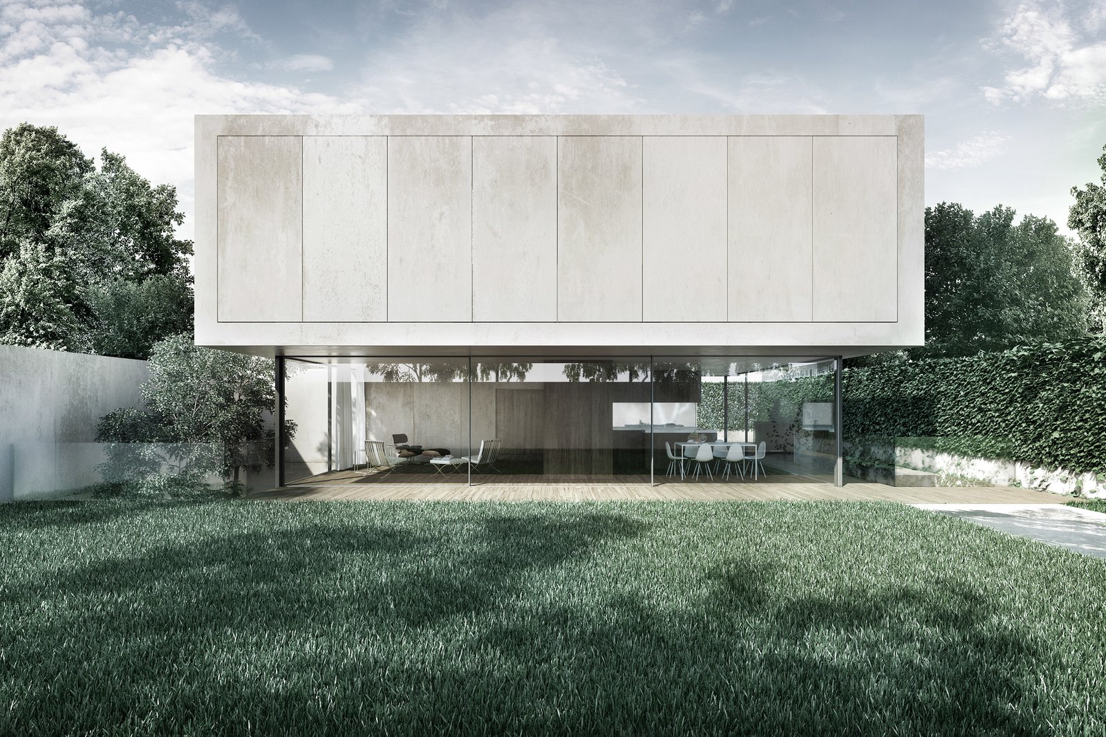 Das Grundstück ist von relativ nah stehenden Nachbarbauten geprägt. Um dennoch einen angemessenen Grad der Privatheit zu erreichen, interpretiert der Entwurf das Element “Mauer“ als Kontinuum, womit eine einzige Mauer das wesentliche raumdefinierende Element des Projekts wird. Im Erdgeschoss definiert sie als an die Grundstücksgrenze versetzte Fassade den Garten und macht ihn zu Teil des Wohnraums, welcher dadurch trotz der nahen Nachbarschaft grosszügig verglast werden kann. Die Mauer begleitet den Bewohner ins Haus und entlang der Treppe ins privatere Obergeschoss, das sie anschliessend als Aussenwand umfasst.