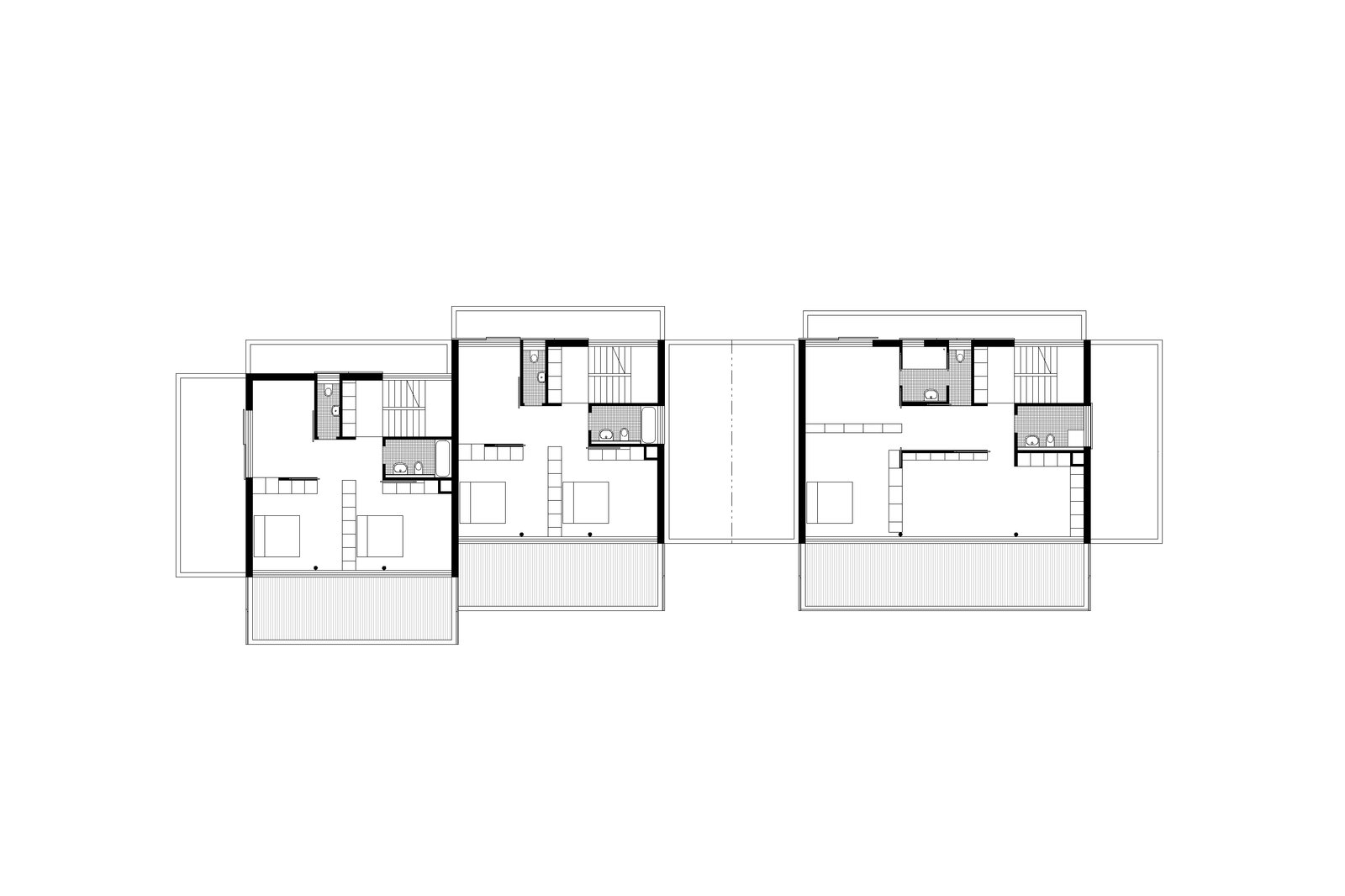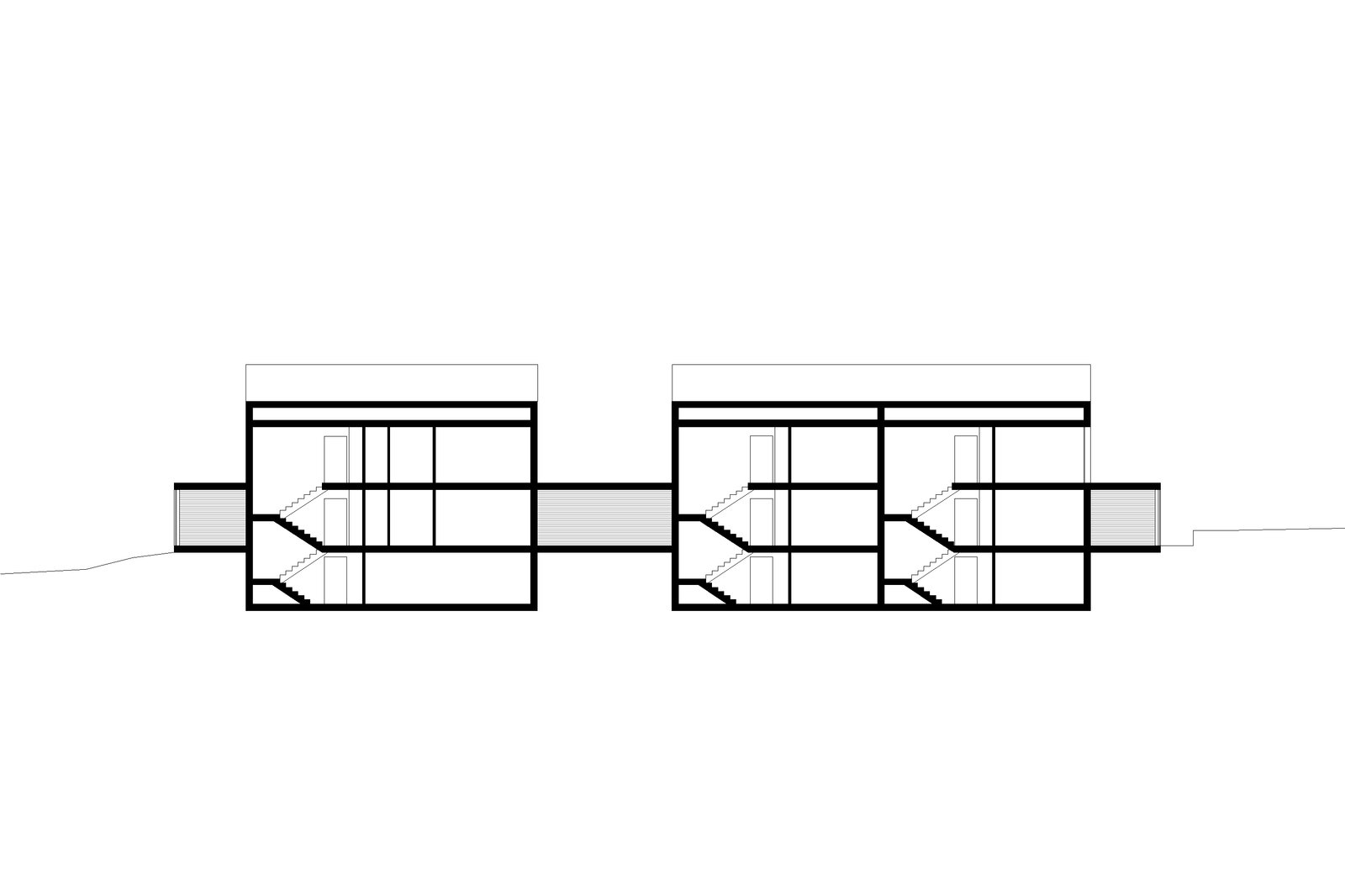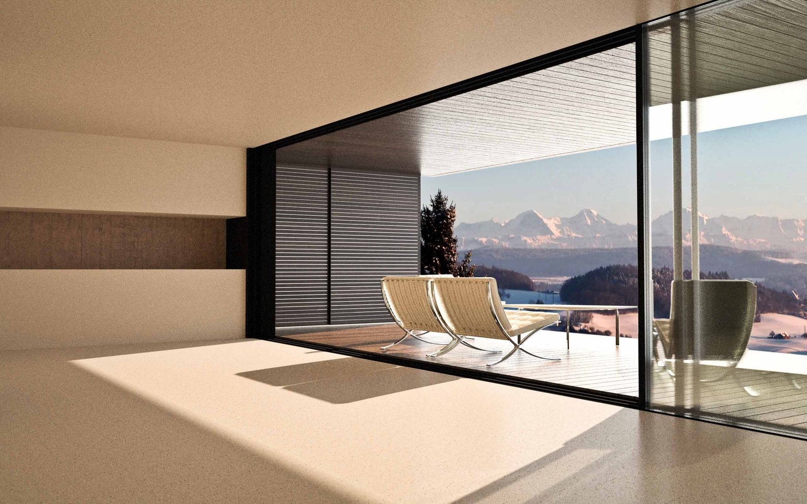 Entwurf für vier Wohneinheiten an einem Südhang mit aussergewöhnlicher Fernsicht in die Alpen. Alle Wohnräume sind daher mit vorgelagerten Aussenbereichen in Form grosszügiger und gedeckter Verandas ausgestattet.