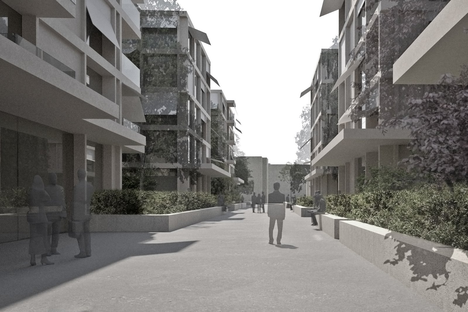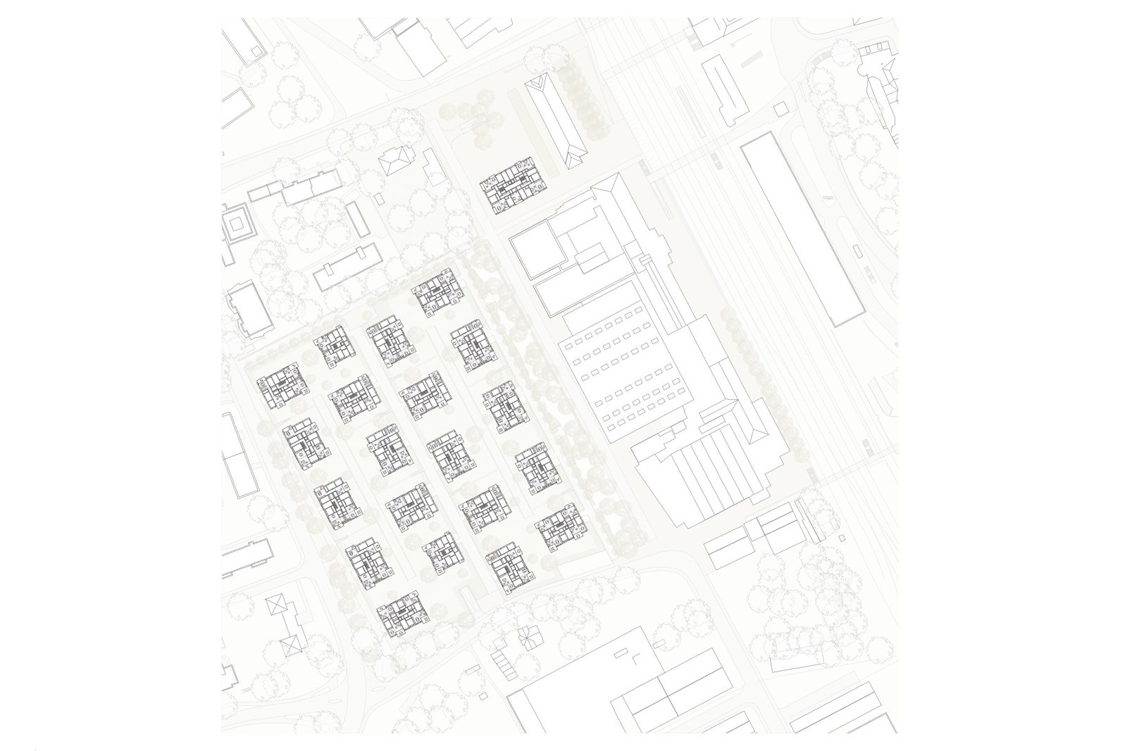 Den Kreuzungspunkt der neuen Wegachsen von Parkraum und Ost-West gerichtetem Weg besetzt ein Hochhaus-Solitär. Das Hochhaus ist grossräumlicher Orientierungspunkt für die Wegverbindung zum Bahnhof und für den öffentlichen Aufenthaltsraum.