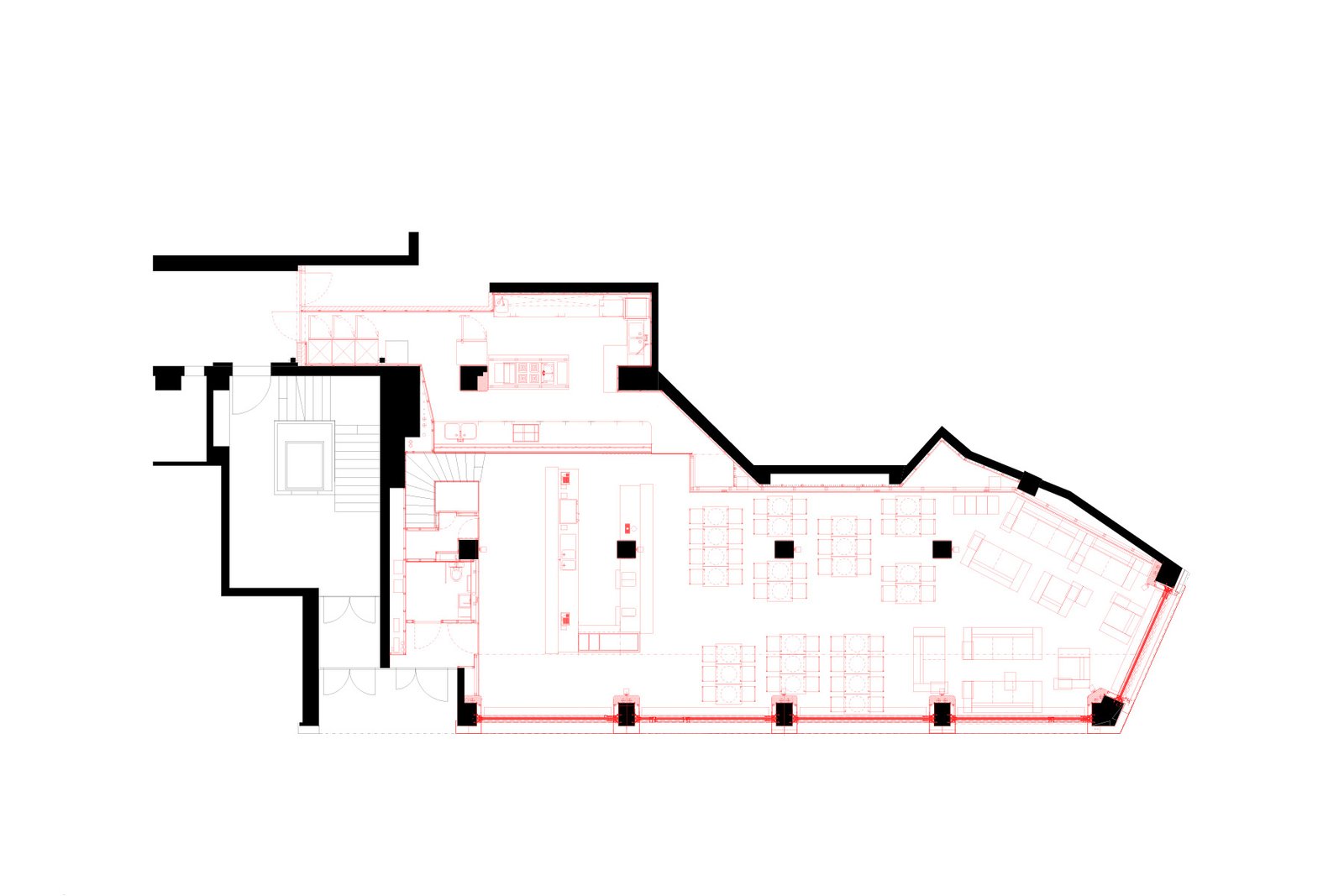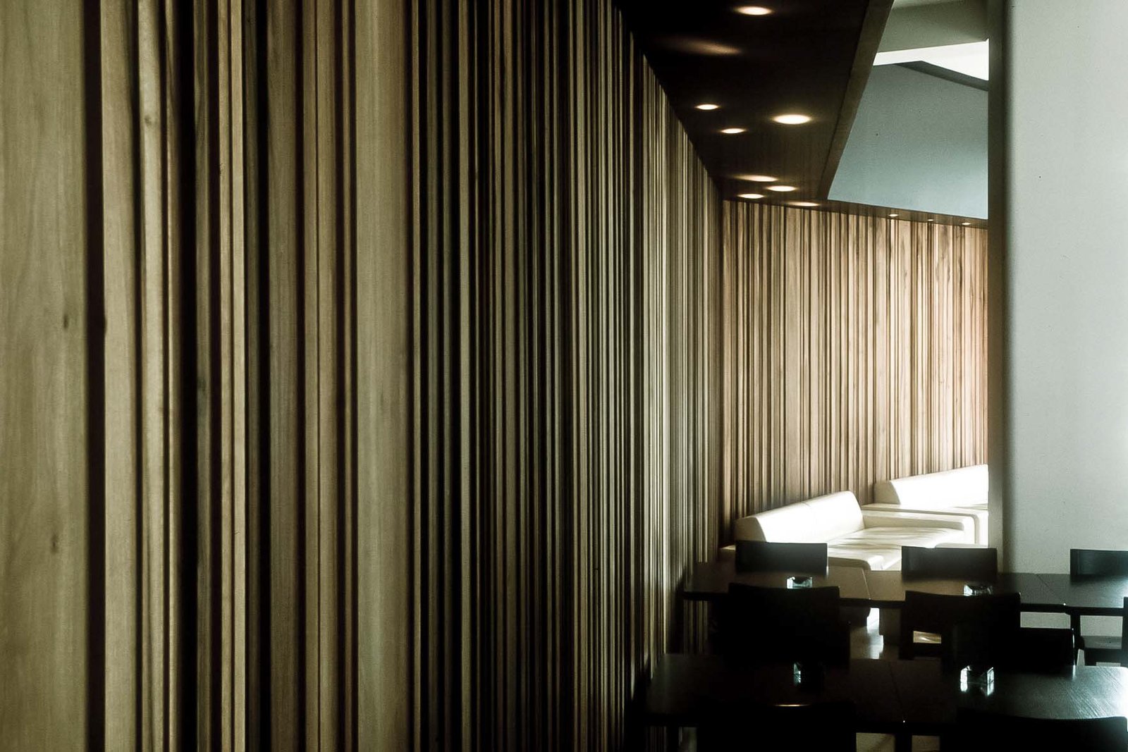 Neben der Klärung der Bausubstanz bestimmen drei identitätsstiftende Elemente den Charakter der Bar. Zum einen konnte unter Nutzung der bestehenden Bodenöffnungen zum Keller eine sogenannte Senkfront eingebaut werden. Diese stellt auf Knopfdruck eine klassische Arkardensituation her, indem die Fensterfront vollständig in den Keller abgesenkt wird. Dies ermöglicht es, den Innenraum in einen überdachten Aussenraum zu verwandeln, was für den Betrieb im Sommer von grossem Vorteil ist. Die Rückwände des Lokals bilden als Relief in massivem Nussbaumholz einen plastischen, stimmungsgebenden Hintergrund, dienen aber auch der Schalldiffusion. Im Untergeschoss konnte durch Umlegen der Haustechnik die ursprüngliche Raumhöhe wieder hergestellt werden, womit es möglich wurde, die Toiletten als freistehenden Sichtbeton-Monlith, als Raum im Raum auszubilden.