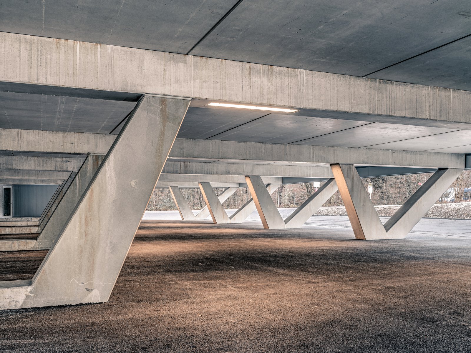 Das Tragen der Halle wird durch ein Raster von Stützen inszeniert, deren spezifische Form im Verbund mit der Decke einen steifen Sichtbetontisch bilden. Auf diesem ruht eine Stahlskelettkonstruktion, die einen stützenfreien Innenraum über den Spielfeldern aufspannt.