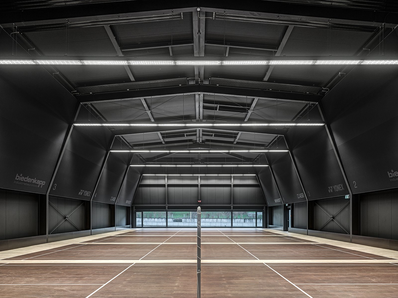 Die räumlichen Eigenschaften des Badmintonspiels werden so im Rhythmus der Tragstruktur sowie der polygonalen Geometrie des Hallenvolumens innen wie aussen erlebbar.