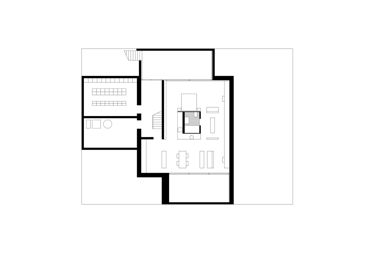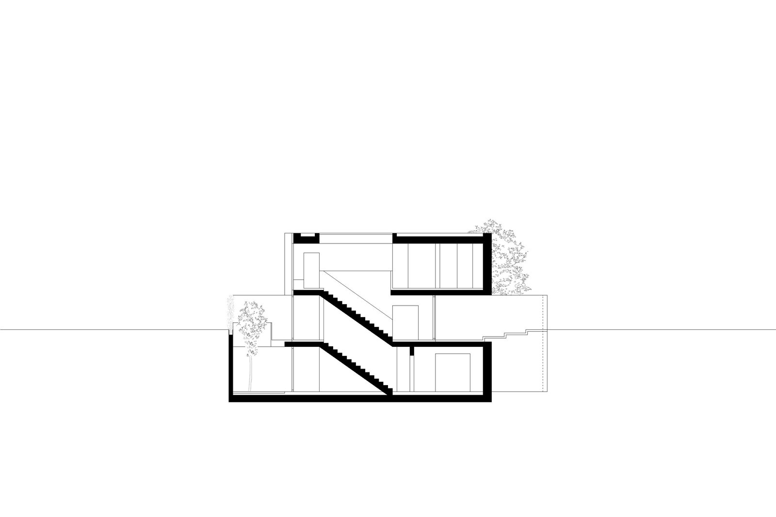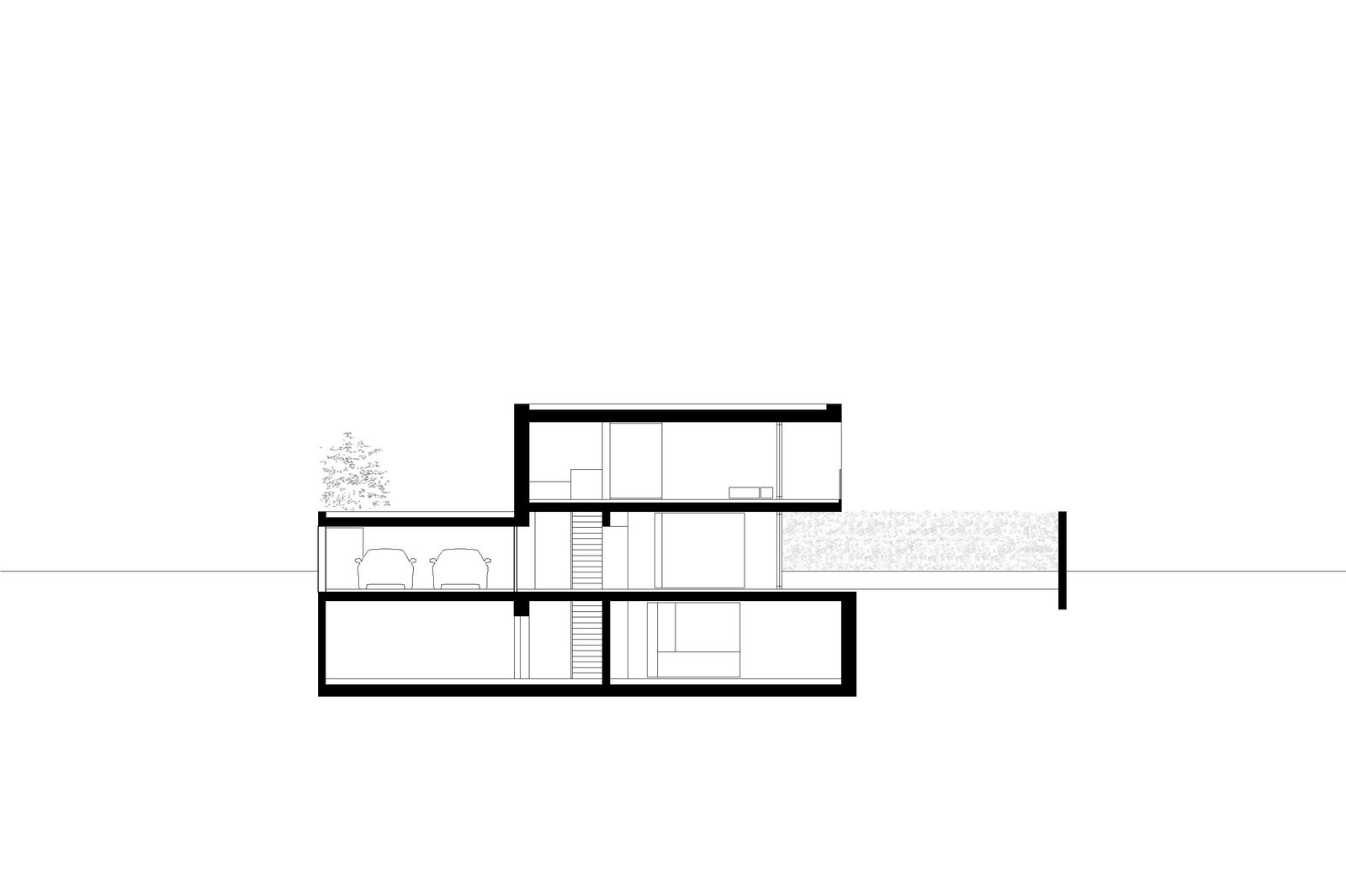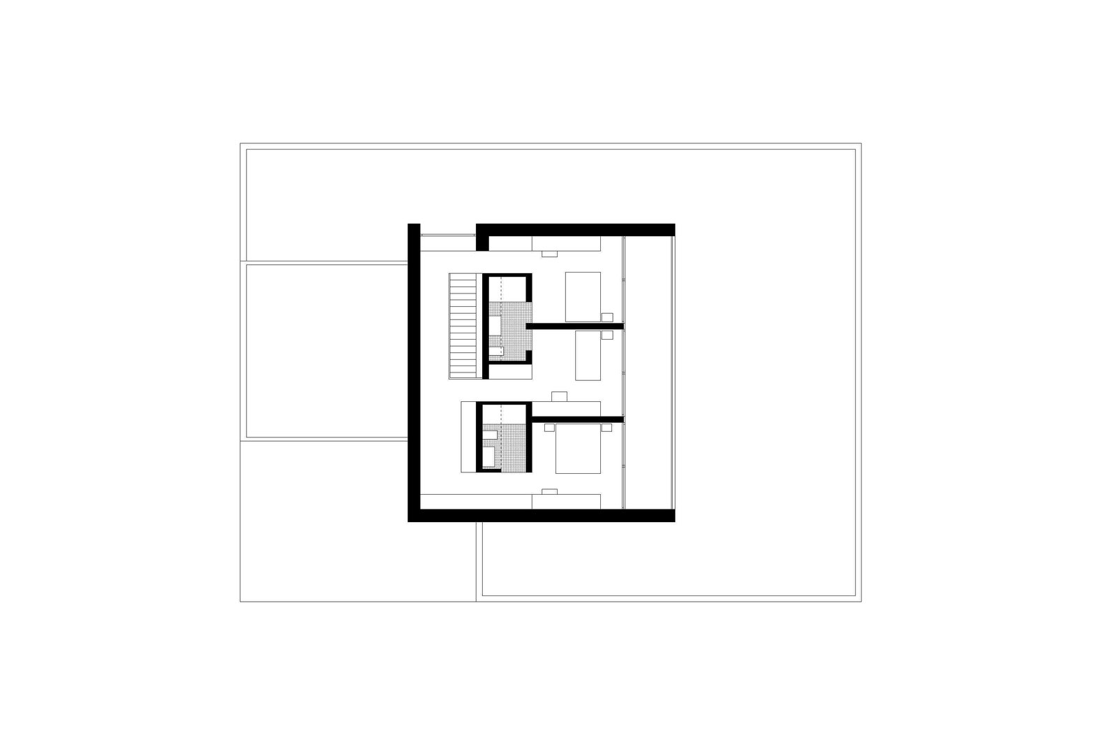 Das Grundstück ist von relativ nah stehenden Nachbarbauten geprägt. Um dennoch einen angemessenen Grad der Privatheit zu erreichen, interpretiert der Entwurf das Element “Mauer“ als Kontinuum, womit eine einzige Mauer das wesentliche raumdefinierende Element des Projekts wird. Im Erdgeschoss definiert sie als an die Grundstücksgrenze versetzte Fassade den Garten und macht ihn zu Teil des Wohnraums, welcher dadurch trotz der nahen Nachbarschaft grosszügig verglast werden kann. Die Mauer begleitet den Bewohner ins Haus und entlang der Treppe ins privatere Obergeschoss, das sie anschliessend als Aussenwand umfasst.