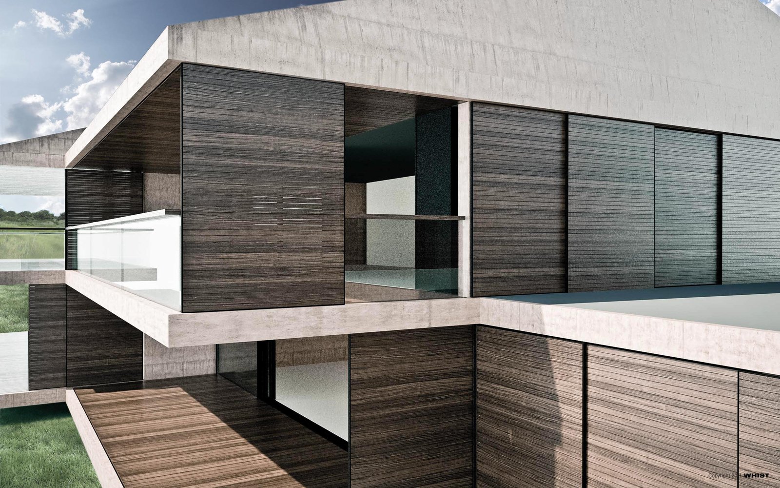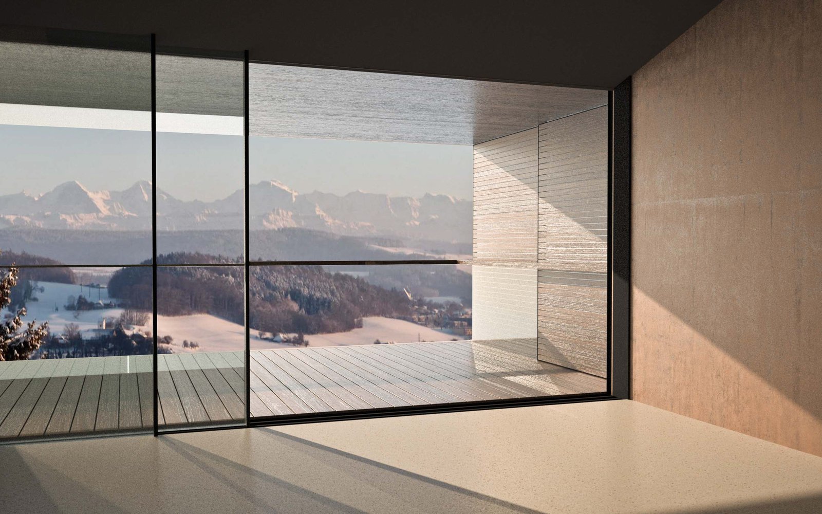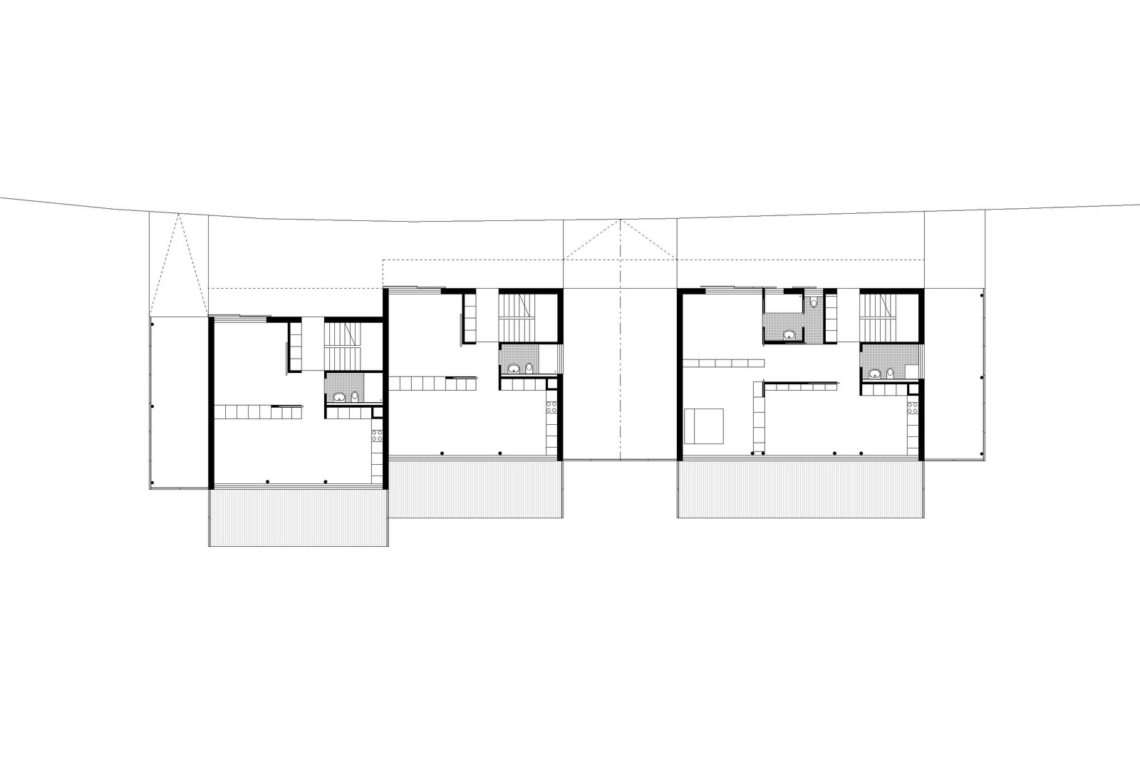Entwurf für vier Wohneinheiten an einem Südhang mit aussergewöhnlicher Fernsicht in die Alpen. Alle Wohnräume sind daher mit vorgelagerten Aussenbereichen in Form grosszügiger und gedeckter Verandas ausgestattet.