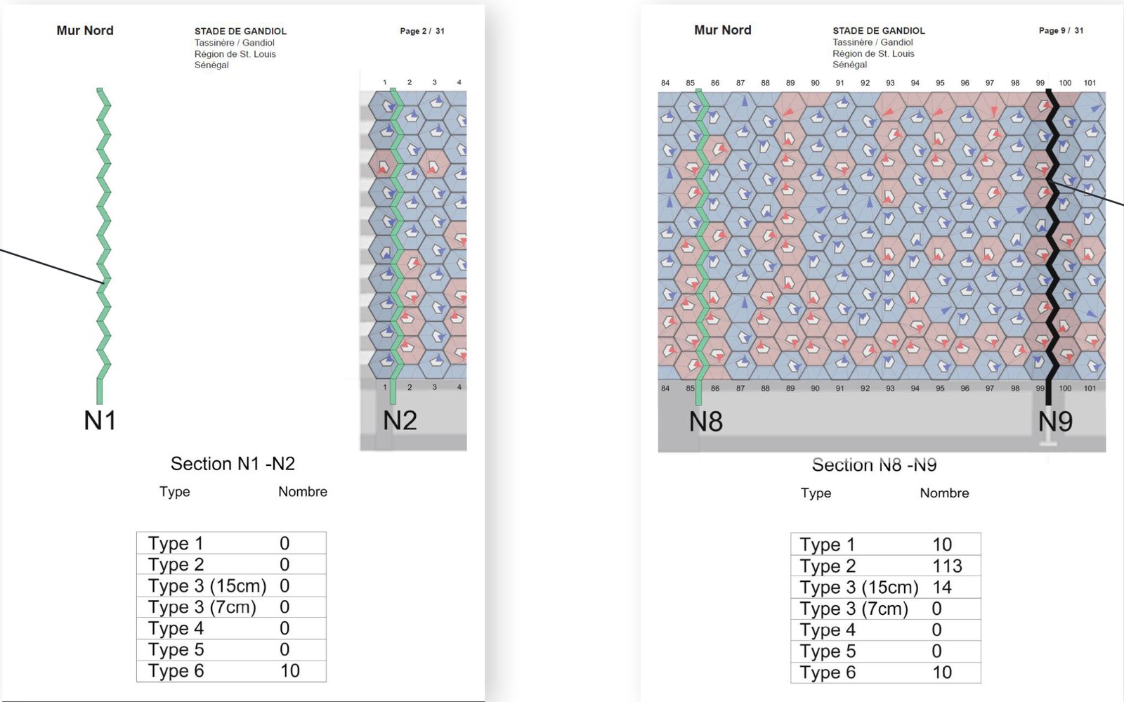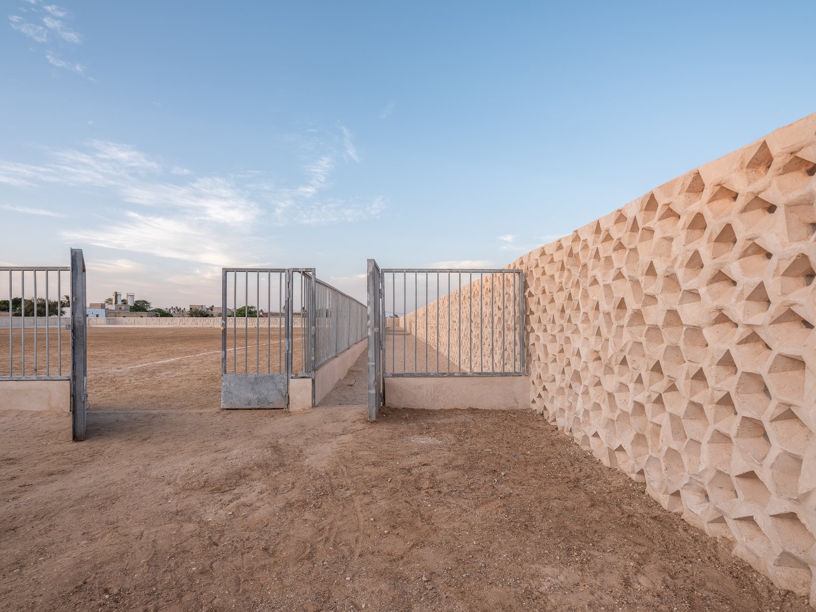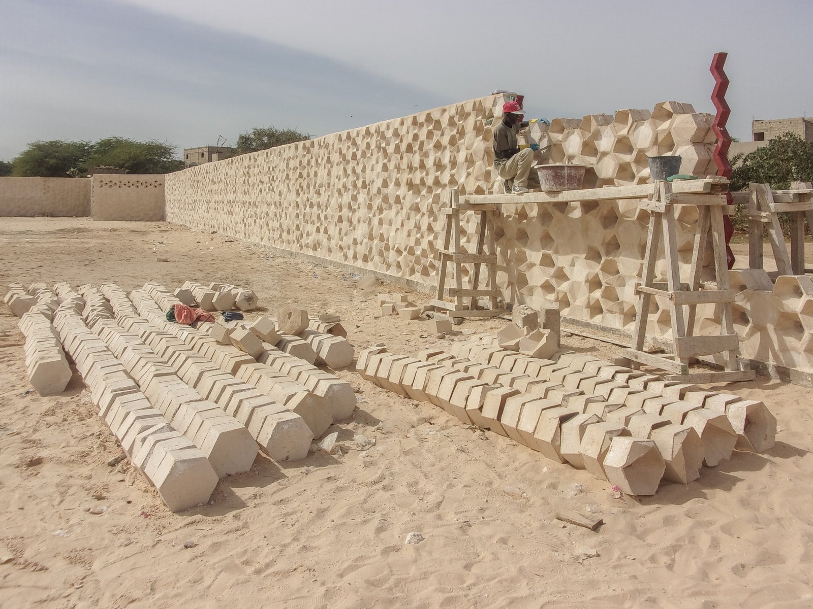 Im Auftrag der Non-Profit-Organisation „Aide Gandiole“ entwarfen wir ein bescheidenes Fussball-Stadion für die Ortschaft Gandiole und deren Fussballverein. Das Projekt besteht grundsätzlich aus zwei Wänden um ein Fußballfeld, die Aussenwand und eine Trennwand zwischen Spielfeld und Zuschauerzone. Beide Wände sind durch eine Tribüne verbunden. Die Aussenwand des Stadions besteht aus hexagonalen Steinen, die speziell für dieses Gebäude entworfen wurden und in Handarbeit vor Ort erstellt werden. Sie sind so angeordnet, dass ein plastisches Relief und unterschiedliche Grade von Transparenz entstehen. Zwei Tore im Norden und Süden bieten Einlass für Zuschauer (Nord) und Spieler (Süd). Vier an der Aussenwand anliegende Gebäude beherbergen den Eingangsbereich, die Garderobe für Spieler, die Toiletten für die Zuschauer und ein Büro mit Lagerraum für die Materialien des Sportvereins.