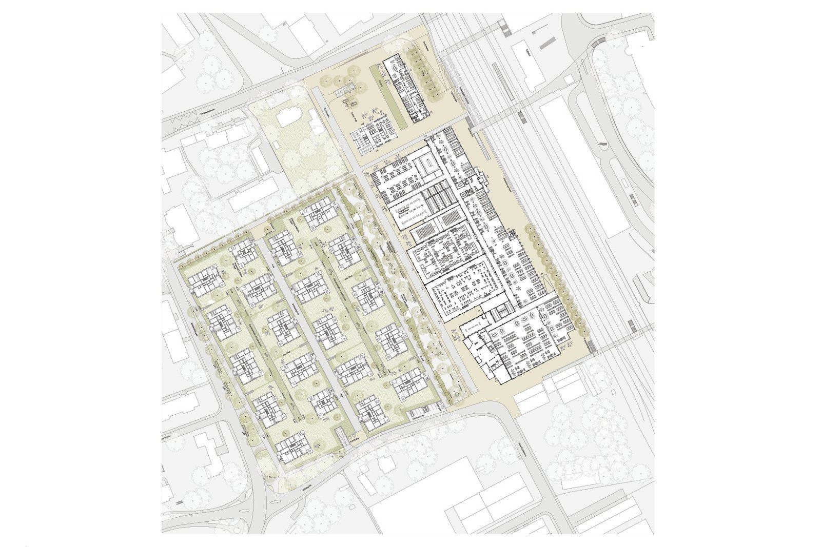 Das Areal gliedert sich mit dem Hauptgebäude in den nordöstlichen Streifen entlang der Bahn und in das südwestliche Baufeld. Grundidee des Projektes ist es, das heutige räumliche Vakuum zu verdichten und entlang diesen Teil-Arealen auf einen zentralen Freiraum zu komprimieren. Er ist Reminiszenz der Siedlungsnaht zwischen Wohnen und Industrie, wird aber positiv besetzt als öffentlicher Parkraum, der neues Bindeglied und Identifikationsraum des Stadtgebiets jenseits der Bahn wird.