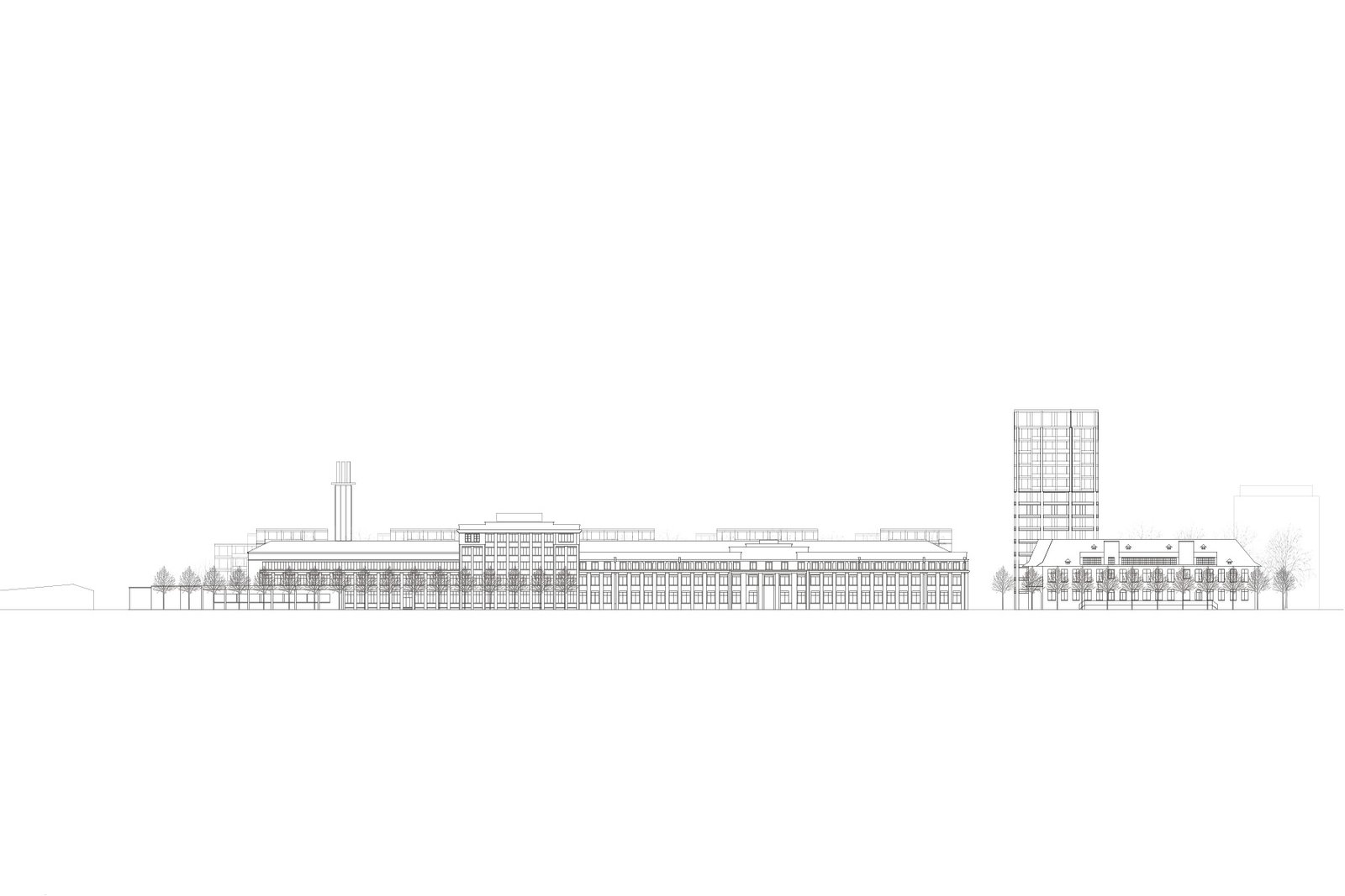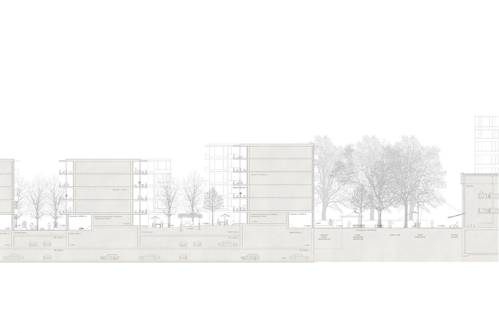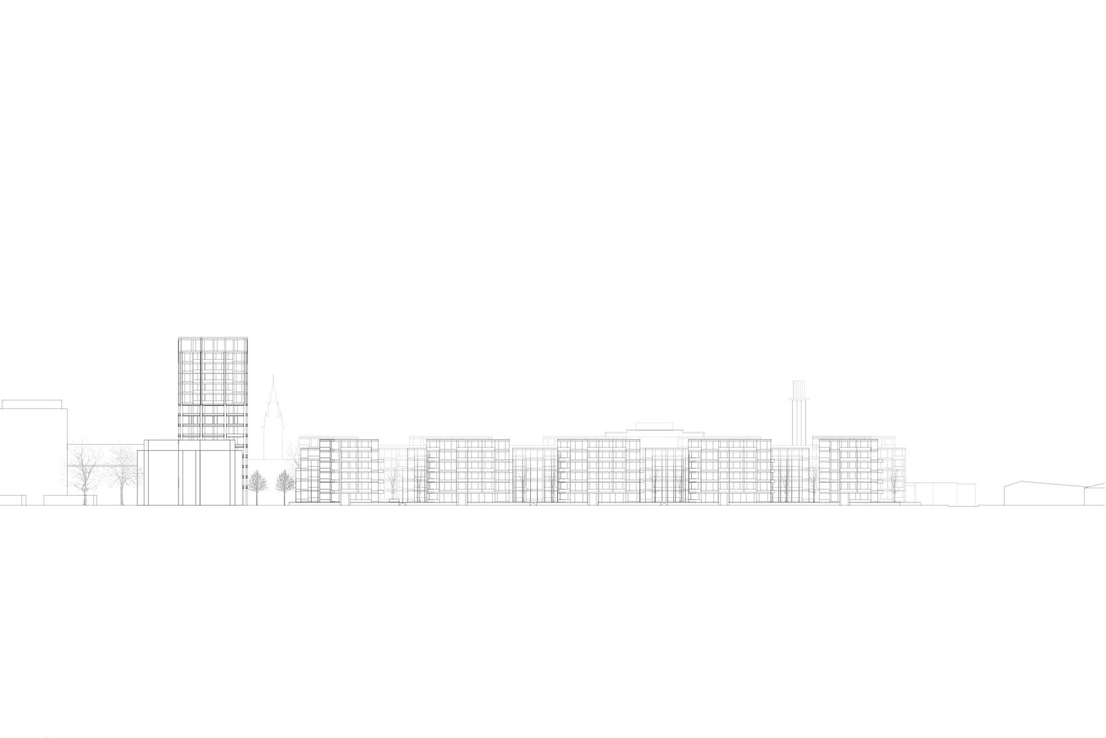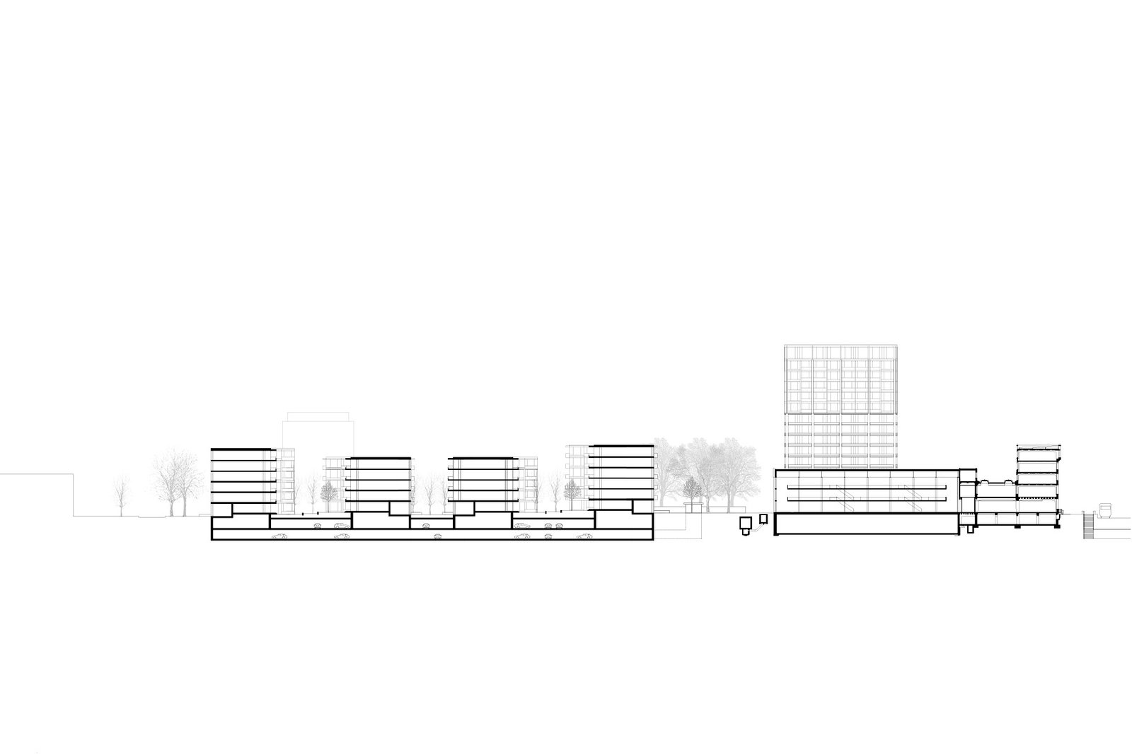 Den Kreuzungspunkt der neuen Wegachsen von Parkraum und Ost-West gerichtetem Weg besetzt ein Hochhaus-Solitär. Das Hochhaus ist grossräumlicher Orientierungspunkt für die Wegverbindung zum Bahnhof und für den öffentlichen Aufenthaltsraum.