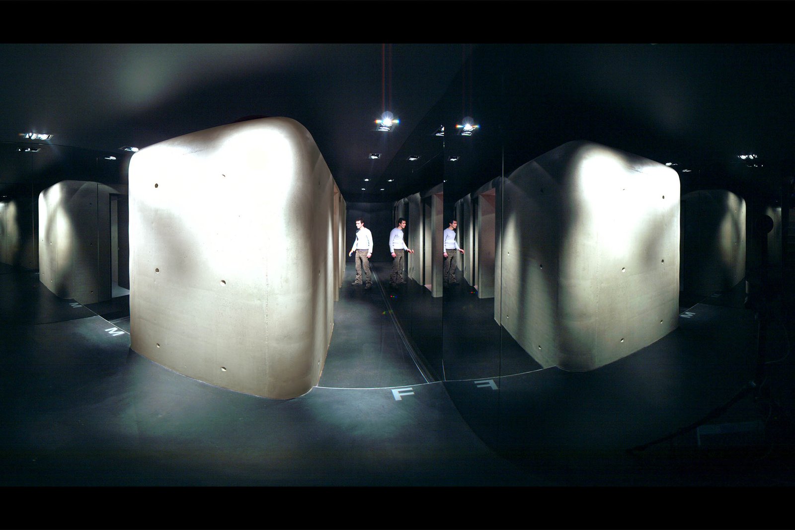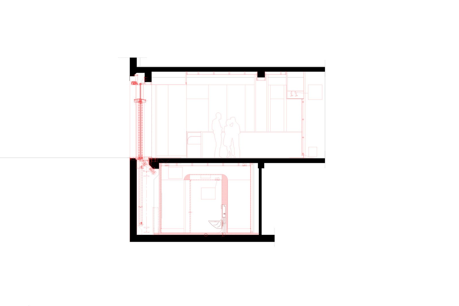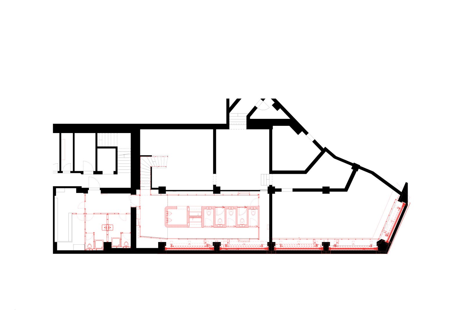 Neben der Klärung der Bausubstanz bestimmen drei identitätsstiftende Elemente den Charakter der Bar. Zum einen konnte unter Nutzung der bestehenden Bodenöffnungen zum Keller eine sogenannte Senkfront eingebaut werden. Diese stellt auf Knopfdruck eine klassische Arkardensituation her, indem die Fensterfront vollständig in den Keller abgesenkt wird. Dies ermöglicht es, den Innenraum in einen überdachten Aussenraum zu verwandeln, was für den Betrieb im Sommer von grossem Vorteil ist. Die Rückwände des Lokals bilden als Relief in massivem Nussbaumholz einen plastischen, stimmungsgebenden Hintergrund, dienen aber auch der Schalldiffusion. Im Untergeschoss konnte durch Umlegen der Haustechnik die ursprüngliche Raumhöhe wieder hergestellt werden, womit es möglich wurde, die Toiletten als freistehenden Sichtbeton-Monlith, als Raum im Raum auszubilden.