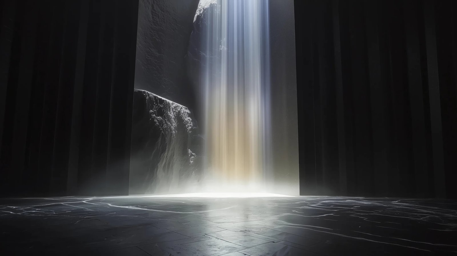 A narrow entry passage introduces a vertically oriented interior environment structured by light, mist, and reflective surfaces. Circulation rises through a sequence of translucent spaces where water and illumination define spatial rhythm. The ascent concludes in an elevated clearing that opens toward the sky and surrounding desert.Movement begins at the base of the structure and ascends through fluid architectural slopes shaped by cascading water and filtered light. Continuous surfaces guide the body upward through interconnected chambers of reflection and shadow. The vertical sequence culminates in an open summit space oriented toward the horizon.