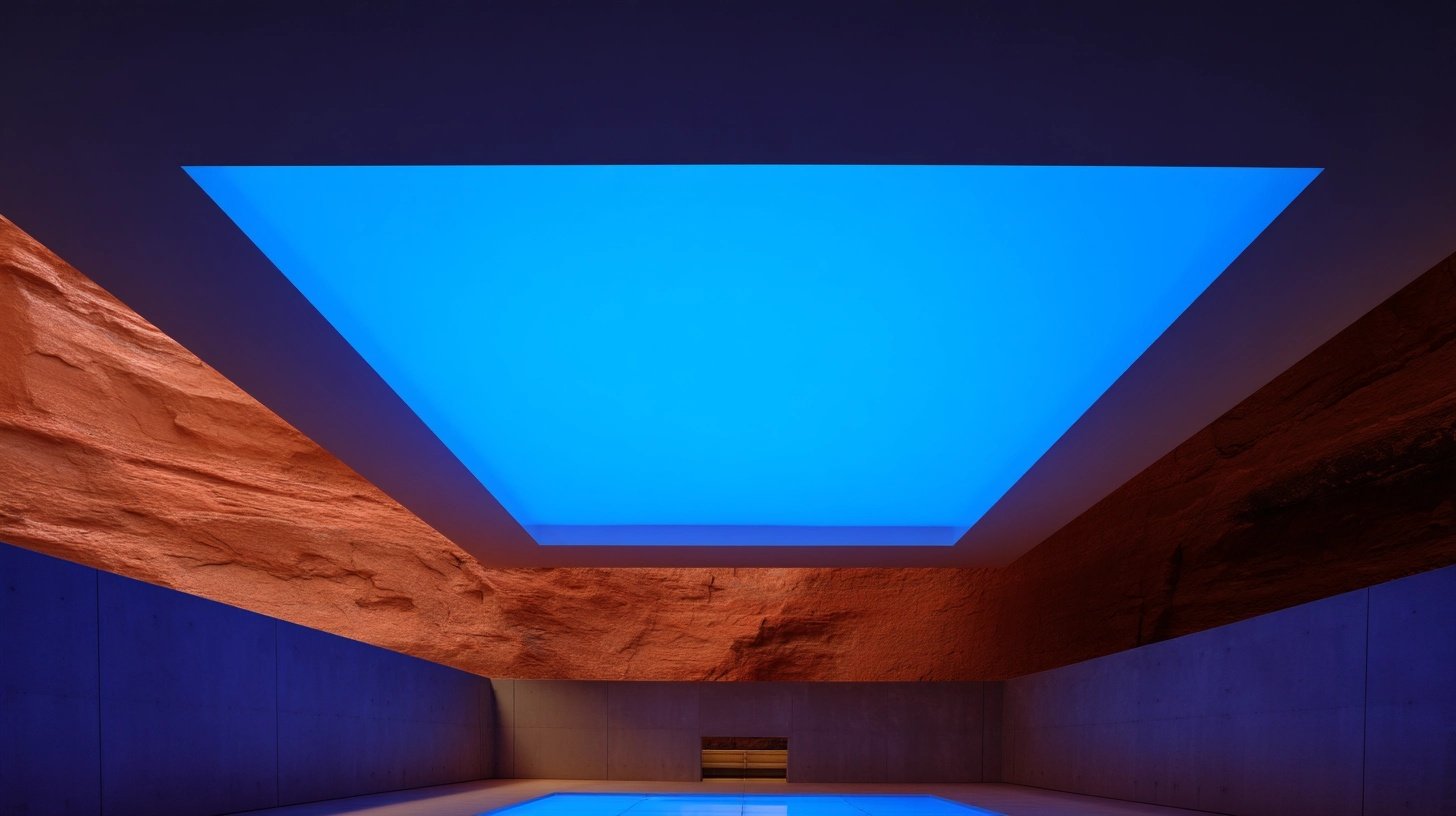 Entry occurs through a recessed canyon incision, where a glazed volume introduces filtered light into the stone interior. Movement follows a linear water axis, guiding the body through softly curved concrete corridors animated by chromatic reflections. The sequence descends into a subterranean light court, where a square aperture frames the sky and saturates the space with luminous blue. Circulation gathers around the central void, emphasizing vertical orientation and atmospheric stillness. The spatial progression releases toward an elevated terrace, where concrete planes open to the valley beyond. The journey concludes in a suspended horizon, light, air, and landscape aligned in quiet precision.